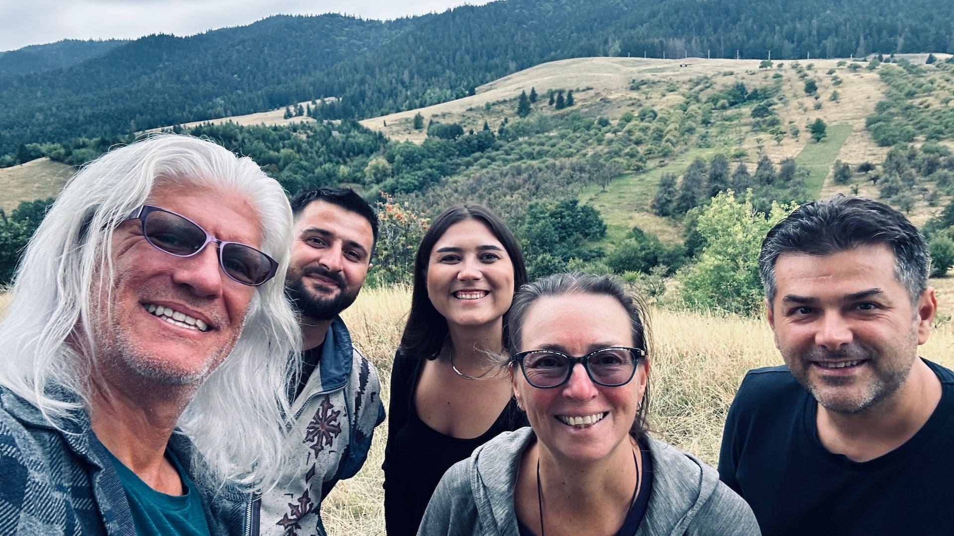Left to Right: Bob, Stefan, Gabby, Kylie, and Ovi, in his plum orchard in rural Romania
