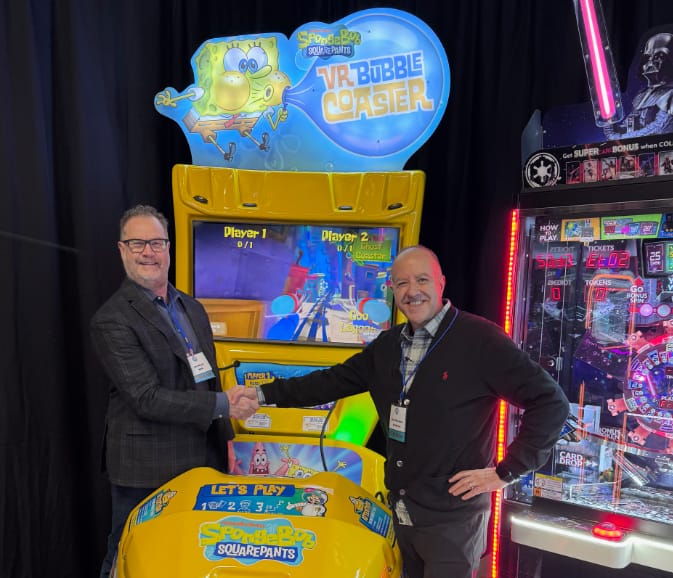 Jim Wyatt (left) with Nick Montano from Andamiro in front of the Spongebob Bubble Coaster. Image courtesy of Replay Magazine